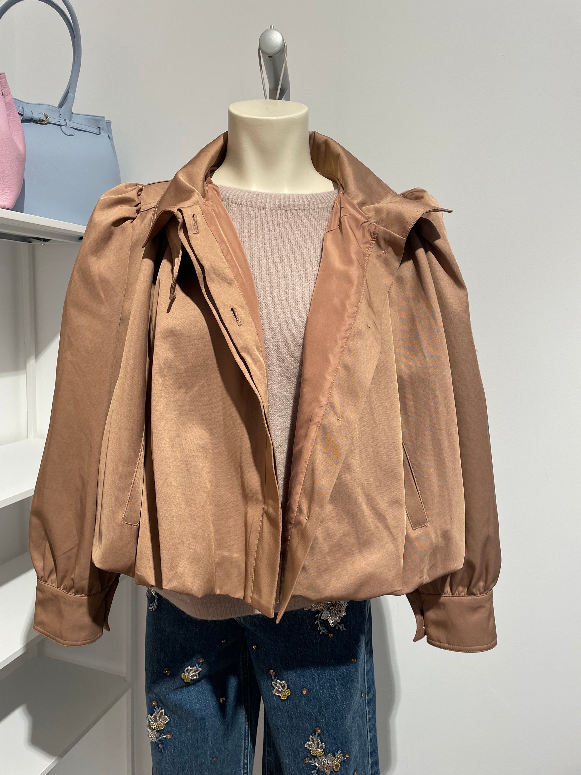 Diese Satin Blousonjacke für Damen vereint zeitlose Eleganz mit moderner Leichtigkeit. Der fließende, leicht glänzende Stoff verleiht der Jacke eine edle Ausstrahlung, während die voluminöse Silhouette mit sanft gerafften Ärmeln einen stilvollen Akzent setzt. Perfekt für Frauen, die hochwertige Mode mit besonderem Design schätzen.
